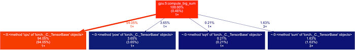 Bởi vì dưới lớp của PyTorch, các phép tính được thực hiện bởi CUDA trên GPU, một thiết bị riêng biệt so với CPU. Khi bạn sử dụng các hàm như .sum()
